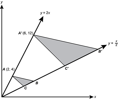 the diagram shows triangle a b c and triangle a prime b prime c prime plotted on an x, y graph. in triangle a b c, the coordinates of point a are 2, 4. in triangle a prime b prime c prime, the coordinates of point a prime are 6, 12. both points lie on the line y equals 2 x. points b, c, b prime, and c prime all lie on the line y equals x over 2.