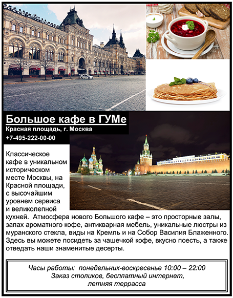 The avertisement has 4 images and text. The images are: A low Angle View Of Gum Department Store At Town Square; A bowl of Ukrainian and Russian national red borsch with sour cream on table; Traditional homemade blinis or crepes on plate; and Intercession Cathedral and the Spassky Tower of Moscow Kremlin at Red Square in Moscow, Russia.